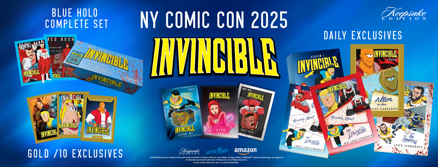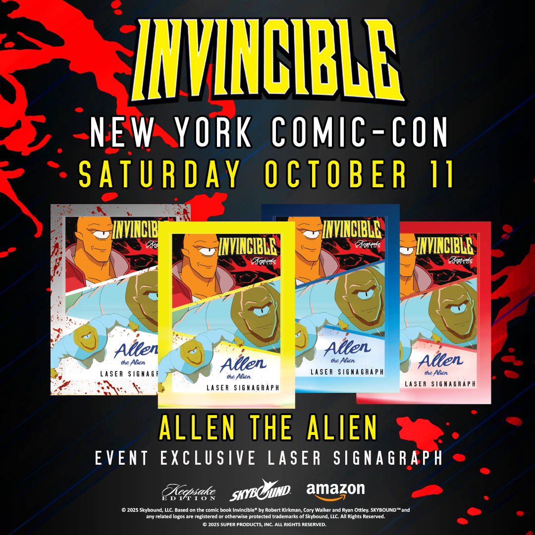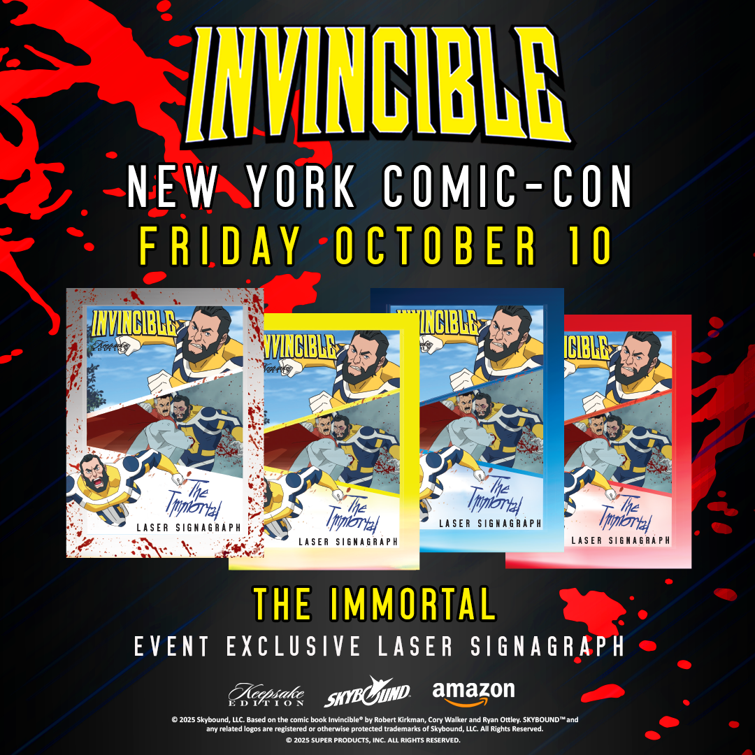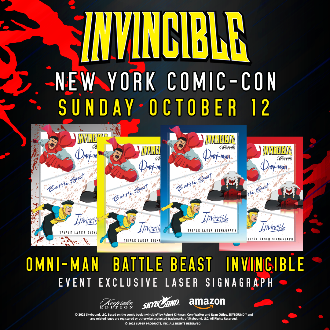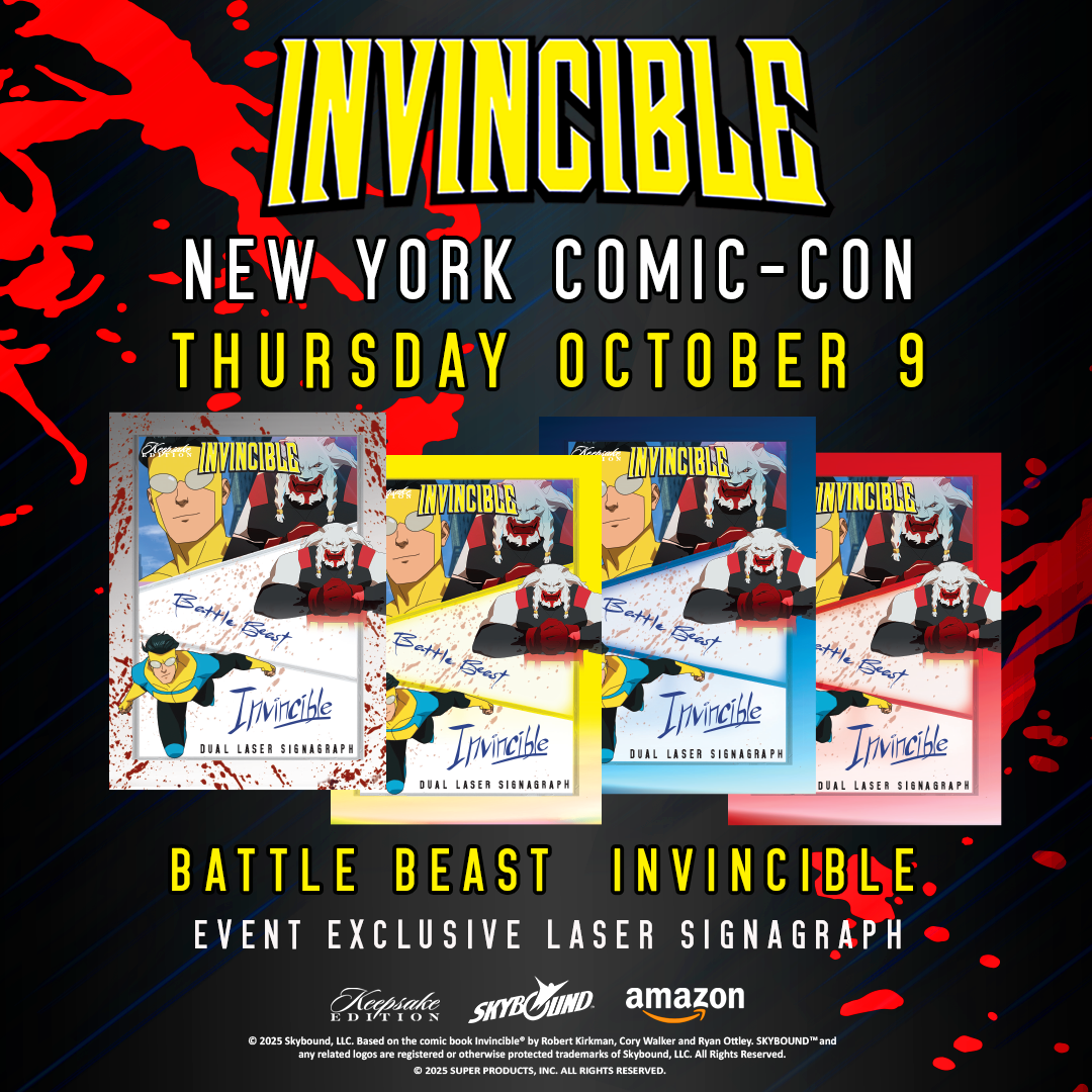 Each day a limited Laser Signagraph Autograph card for Omni Man, Battle Beast, & Invincible will be sold. Only the first customers in line each day will have a chance to purchase these event exclusives!